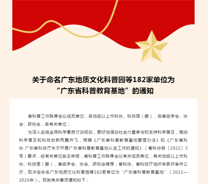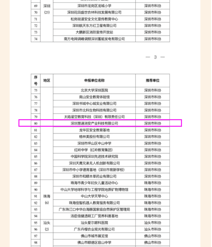 2022年4月15日,廣東省科學(xué)技術(shù)廳和廣東省科學(xué)技術(shù)協(xié)會命名182家單位為“廣東省科普教育基地”(2022—2026年)。深圳23家單位獲評,深圳慧通消安產(chǎn)業(yè)科技有限公司獲此殊榮。